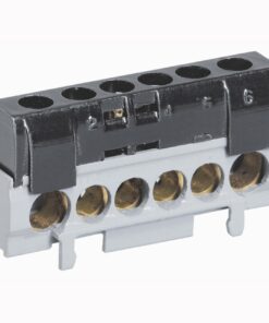 Bornier de phase (noir) isolé IP2X avec capot de sécurité isolant – Longueur 62mm Composé de : – 1 borne d’arrivée pour câble 10mm² à 35mm² – 5 bornes de départ pour câble 6mm² à 25mm² Intensité : – 100A maximum 400V~ avec arrivée 25mm²- 80A maximum 400V~ avec arrivée 16mm²