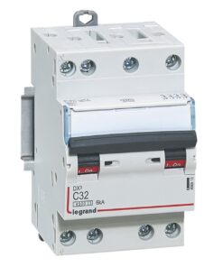 Disjoncteur DX³ tétrapolaire 400V~ pouvoir de coupure : – 4500A conforme à la norme NF EN 60891-1 – 400V~ pour les installations résidentielles- 6kA conforme à la norme EN 60947-2 – 400V~ Protection des départs : arrivée haute et sortie basse par bornes à vis Intensité nominale 32A – Courbe C (déclenchement magnétique entre 5In et 10In) – 3 modules