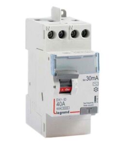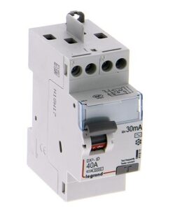 Interrupteur différentiel DX³ bipolaire 230V~ type AC : détecte les défauts à composante alternative Protection tête de groupe : arrivée haute et sortie haute par bornes à vis, permet la répartition optimisée par peigne Intensité nominale 40A – Sensibilité 30mA – 2 modules