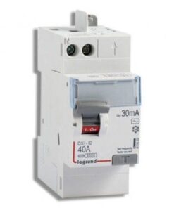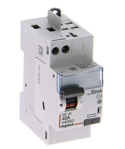 Interrupteur différentiel DX³ bipolaire 230V~ type AC : détecte les défauts à composante alternative Protection tête de groupe : arrivée haute par bornes à vis et sortie haute par bornes automatiques, permet la répartition optimisée par peigne Intensité nominale 40A – Sensibilité 30mA – 2 modules
