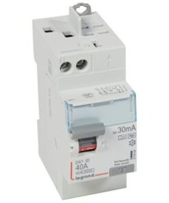 Interrupteur différentiel DX³ bipolaire 230V~ type F : détecte les défauts à composantes alternative et continue, immunité renforcée aux déclenchements intempestifs et détection des courants de défauts hautes fréquences Protection tête de groupe : arrivée haute par bornes à vis et sortie haute par bornes automatiques, permet la répartition optimisée par peigne Intensité nominale 40A – Sensibilité 30mA – 2 modules